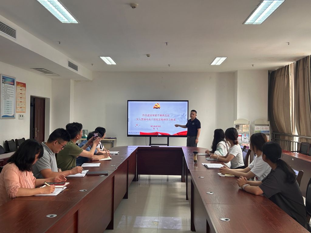 参会人员集中学习了习近平总书记关于深入贯彻中央八项规定精神的重要论述、《党的十八大以来深入贯彻中央八项规定精神的成效和经验》《八项规定改变中国》、“信阳市罗山县10名干部违规吃喝、严重违反中央八项规定精神问题通报”、《党政机关厉行节约反对浪费条例》和中组部《从严从实推进深入贯彻中央八项规定精神学习教育》。陈飞传达了学校5月份深入贯彻中央八项规定精神学习教育工作推进会精神,带领大家深入学习学校《深入贯彻中央八项规定精神学习教育工作提示四》,并指出全体党员干部要统一思想,坚决落实上级决策部署,在维护学院改革发展稳定大局上切实发挥示范引领作用,以实际行动检验学习教育成效。