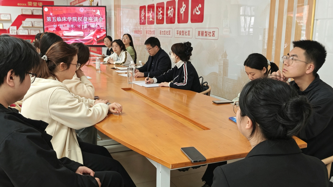 本网讯(通讯员湛涵颖)4月13日上午9:45,第五临床学院于精勤社区召开学生权益座谈会。学院党委副书记焦延林、团委书记陈静和学院学生干部及各班学生代表出席本次会议。